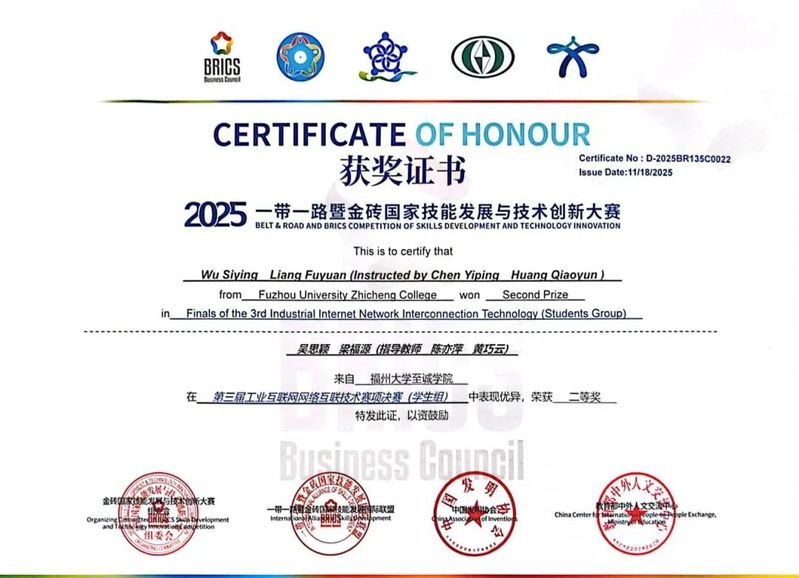 近日,2025一带一路暨金砖国家技能发展与技术创新大赛第二届“工业互联网网络互联技术”赛项全国总决赛在济南顺利举行。我院计算机工程系叶脉ICT俱乐部Nervure战队成员参赛,队员们凭借过硬的实操能力与稳定的现场发挥,在激烈竞争中表现突出。本次比赛由吴汉枨、吴和睿组成的团队以及吴思颖、梁福源组成的团队均荣获全国总决赛二等奖(指导教师:黄巧云、陈亦萍)。同时,福州大学至诚学院获评优秀组织奖,黄巧云、陈亦萍两位老师荣获优秀指导教师称号。