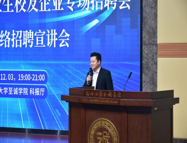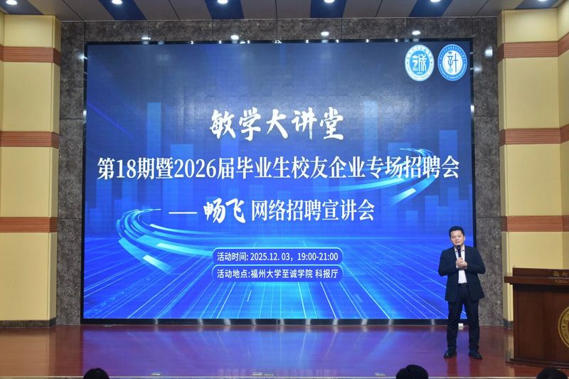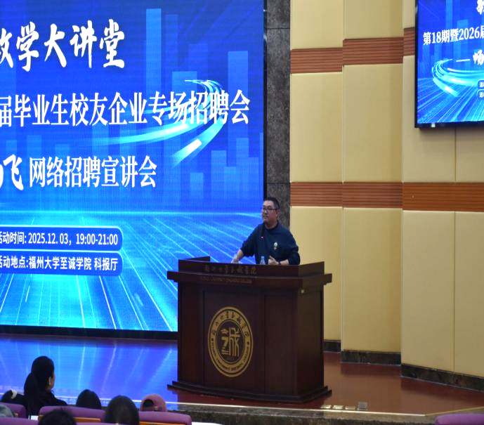 2025年12月3日晚,福州大学至诚学院计算机工程系举办的敏学大讲堂第十八期暨2026届毕业生校友企业专场招聘会——畅飞网络招聘宣讲会在科报厅顺利举办。国家高新技术企业福州畅飞网络核心团队受邀入校,人事总监张帆、产教融合中心经理林垚、实践教学中心经理张绿一同出席,为2026届毕业生分享行业动态。我系党总支书记罗周庆老师与辅导员贺朋飞、何苏栩、包玉芬老师出席,23级与24级数字媒体技术专业学子共同参与。