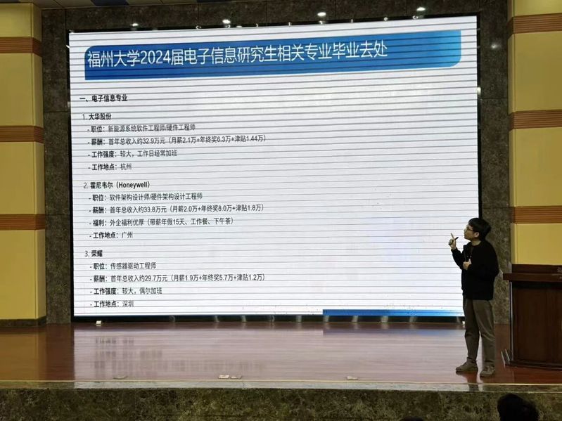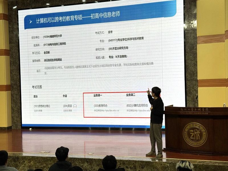 讲座中,江斌老师围绕就业发展、考研趋势、院校规划三大核心板块,结合自身多年考研指导经验,展开了细致深入的分享。他以详实的数据、典型的案例为支撑,精准解读了当前计算机专业考研的整体趋势、命题特点及备考核心要点,让同学们对考研形势有了清晰认知。同时,结合近年各高校招生录取实际情况,江斌老师为同学们科学划分不同层次的目标院校,拆解了择校的核心逻辑,并提供了针对性强、可落地的复习规划建议,帮助大家理清备考思路、找准复习方向,有效解决同学们择校、备考的困惑。